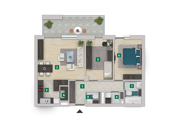 Az adatlapon megjelölt alaprajzi méretek vakolatlan falak közötti méretek, a kivitelezés során kismértékű méretváltozás lehetséges. Ezen dokumentációban közölt adatok a kiviteli tervek alapján kerültek megállapításra kizárólag tájékoztató jelleggel, nem minősülnek ajánlattételnek. Az alaprajzon feltüntetett bútorok tájékoztató jellegűek, azok rajzi elhelyezése nem feltétlenül tükrözi azok jövőbeni elhelyezhetőségét, illetve azok nem képzik a lakás részét.